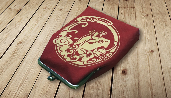 赤いむら染めの生地にかえる柄を抜染しました。内布もブルー生地を同柄で抜染したものを使用しています。